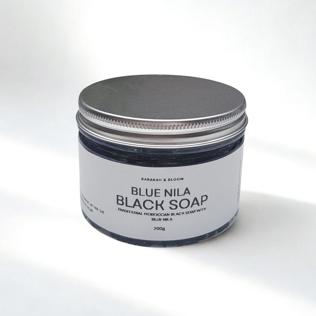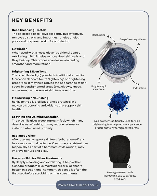 Experience a true Moroccan hammam ritual with our Blue Nila Beldi Soap. This traditional olive-based soap is enriched with Blue Nila powder to help brighten and even skin tone, while a subtle touch of frankincense adds a calming aroma.
