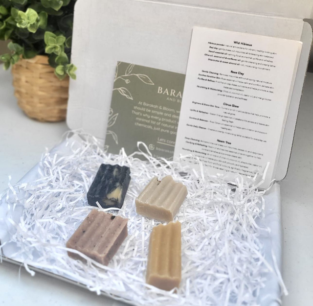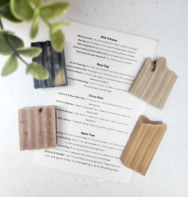 The small soap samples come in different shapes and cuts, making every box unique. This box includes 4 of our newest soaps: Citrus Glow, Neem Tree, Wild Hibiscus, and Rose Clay. It’s the perfect way to explore our range and discover new favourites before committing to a full bar.